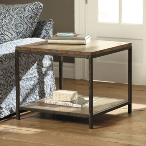 Generous lower shelf offers plenty of space for display or bedside essentials. Aug 10 2015 - The clean architectural design of this metal frame end table is based on an antique bricklayers table. Planked wood top is heavily distressed and finished with a wash to bring out its natural grain and character.